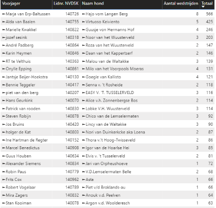 Mark Klein Gotink met Jaxx diskwalificatie (geen lid) Angela Klein Gotink met Quint v. 't Hoog-Twisseveld geen diploma 41 punten (geen lid) Rubin te Velthuis met Malou van de Waltakke geen diploma geen punten Bennie Teggeler met Senna v.h. Rosheide geen diploma 47 punten André Padberg met Roza van het Wuusterveld geen diploma 73 punten Mariëlle Kwakkel met Guusje von Hermannshof geen diploma 48 punten Nico Punt met Jambo v.d. Orpheushoeve geen diploma geen punten Patrick van Rooden met Lobke van het Wuusterveld diskwalificatie Jozef Sesink met Noor van het Wuusterveld geen diploma 49 punten Arie Oosterbroek met Dasja Indy van het Kappertserf geen diploma geen punten Onylle Epping met Milo van het Voorpoels Moeras geen diploma 41 punten